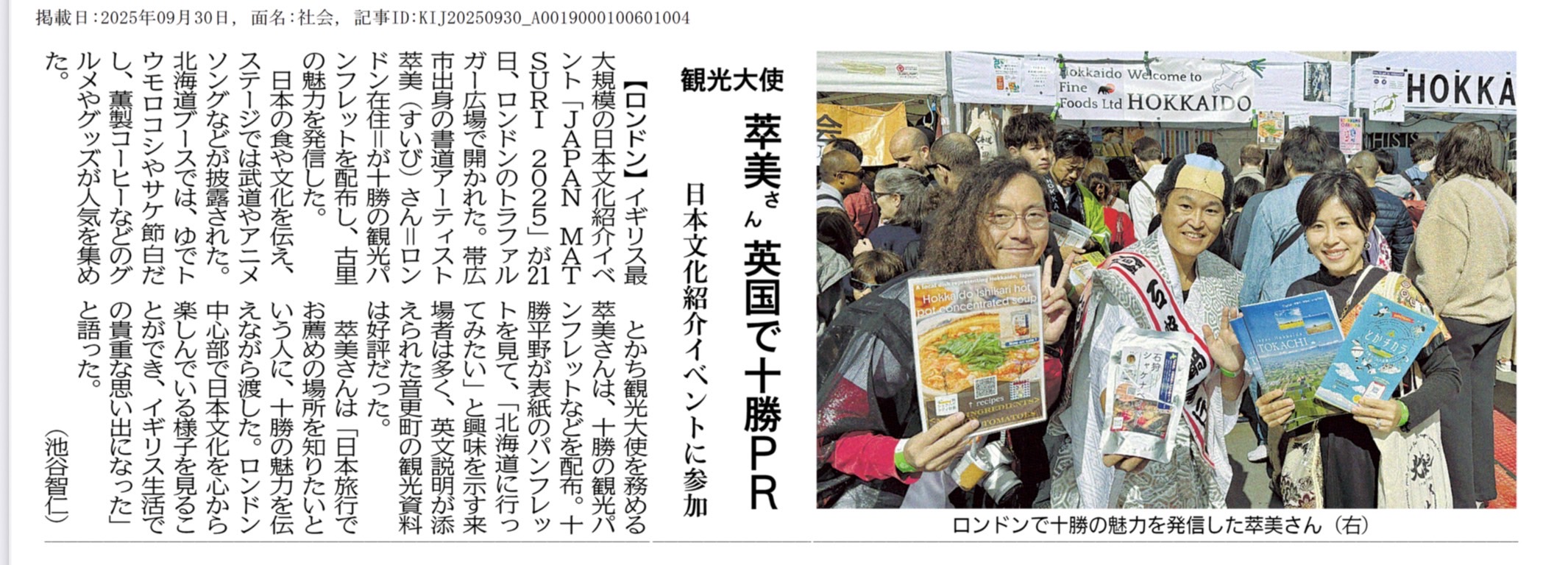 十勝毎日新聞に帯広出身でロンドン在住の書道家、観光大使の萃美(すいび)さんの記事があります。 (画像をクリックすると大きく表示されます)