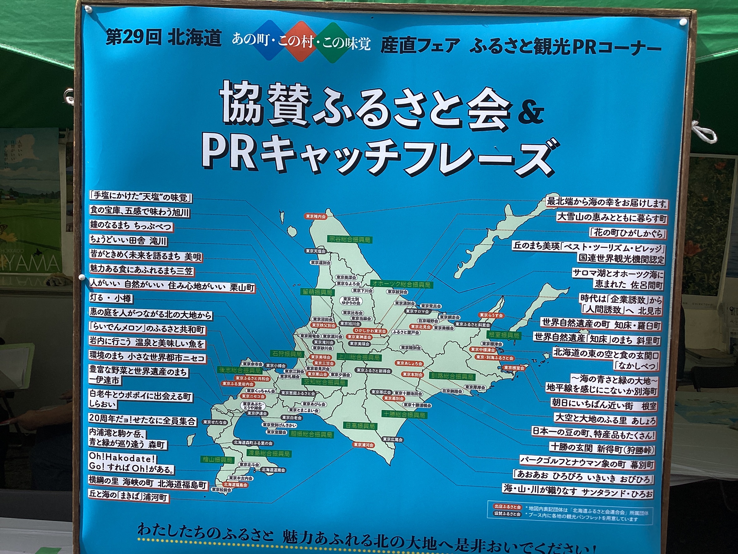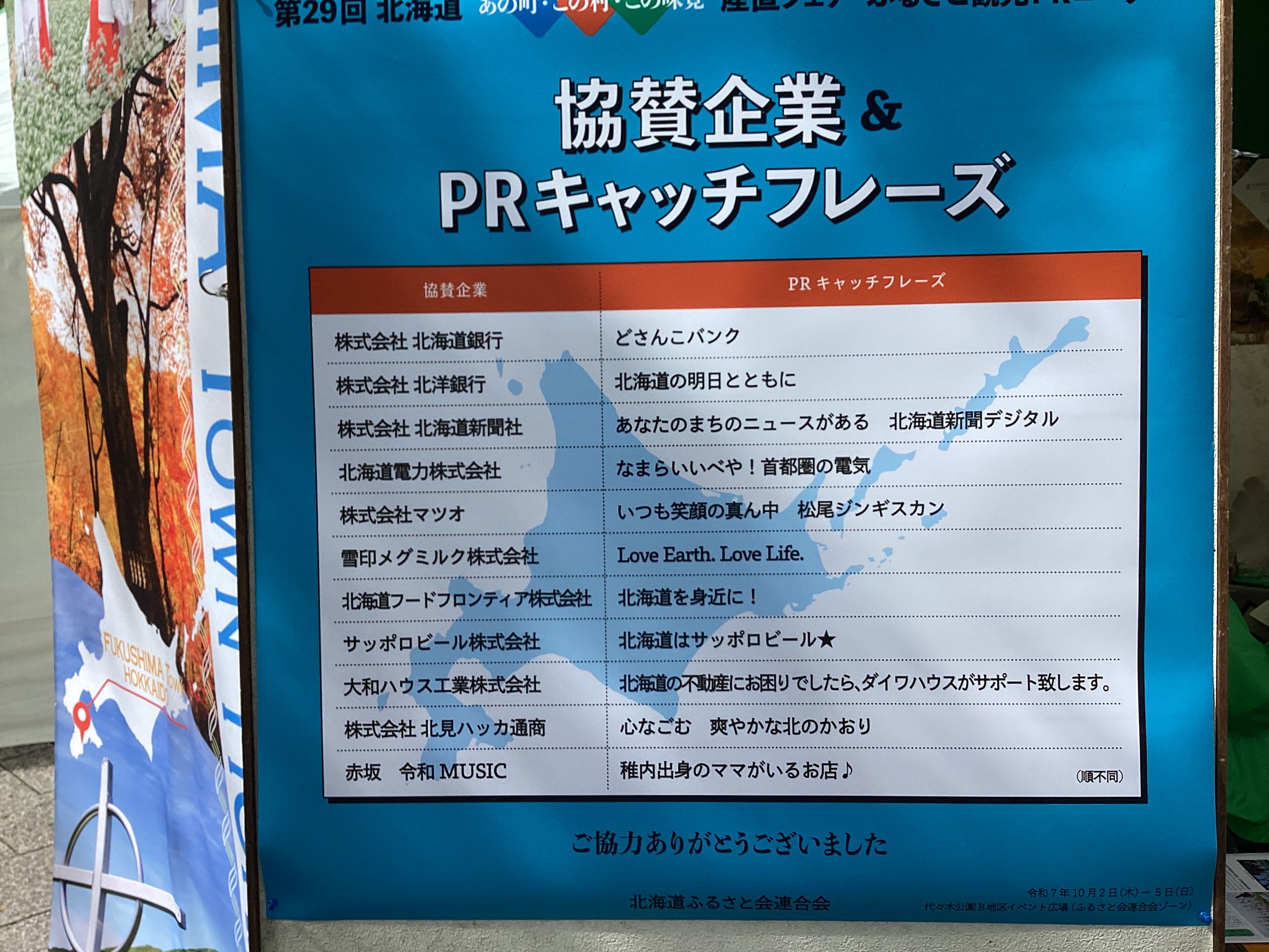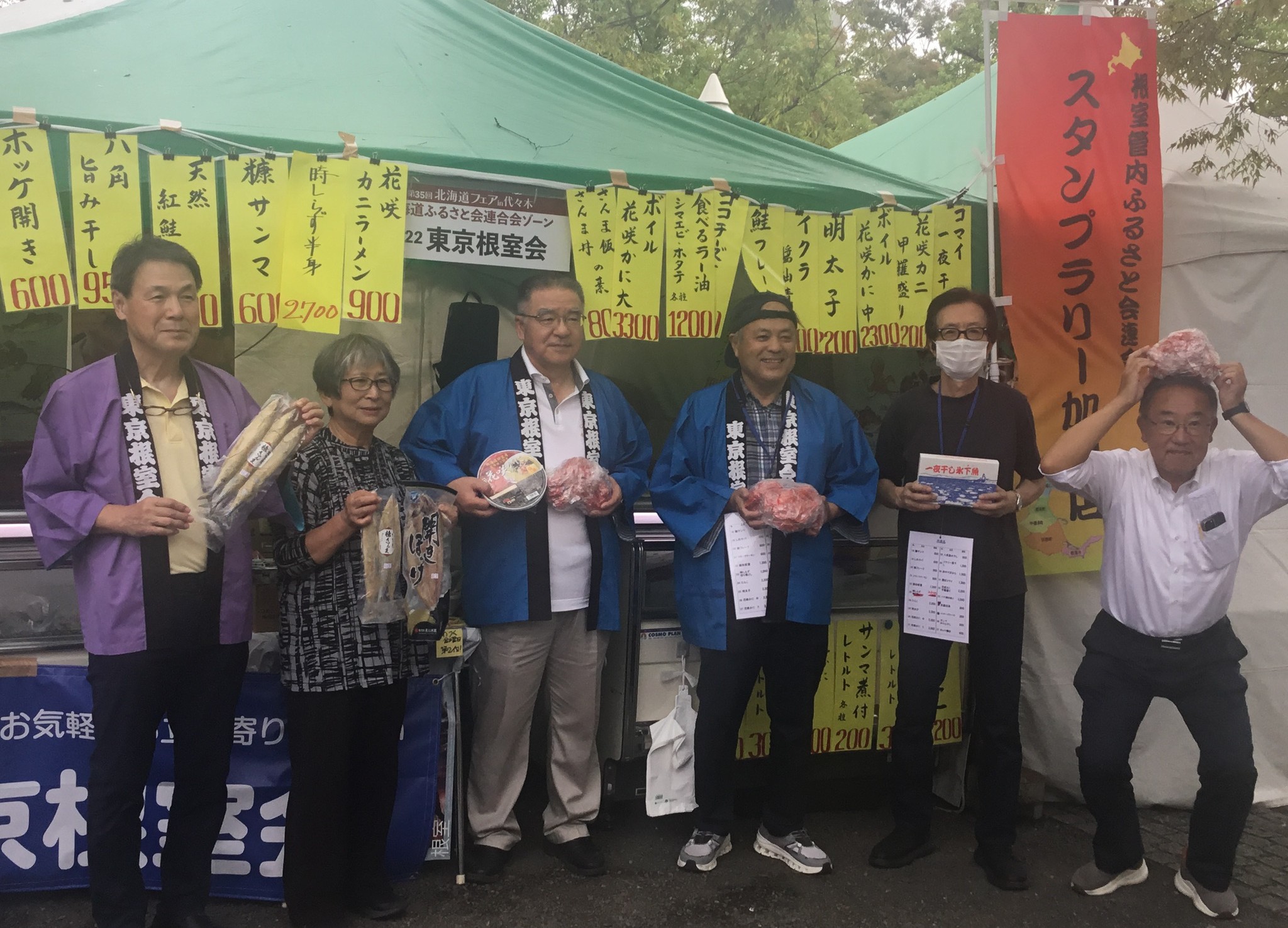 令和7年10月2日(木)から4日間東京代々木公園B地区イベント広場にて、ふるさと会22団体が参加して開催されました。今年は北海道東京事務所も出展し、初の官民連携の開催となりました。期間中は北海道の鈴木直道知事が来場され、会場内から大変な歓迎を受けました。根室管内の1市4町のスタンプラリーという試みも実施されました。全体の入場者は18万4,000人(前年比122%)、売上高は速報値で1,900万円(前年比107%)でした。来年は第30回の節目となります。北海道の魅力をさらに発信できるよう努力いたします。
